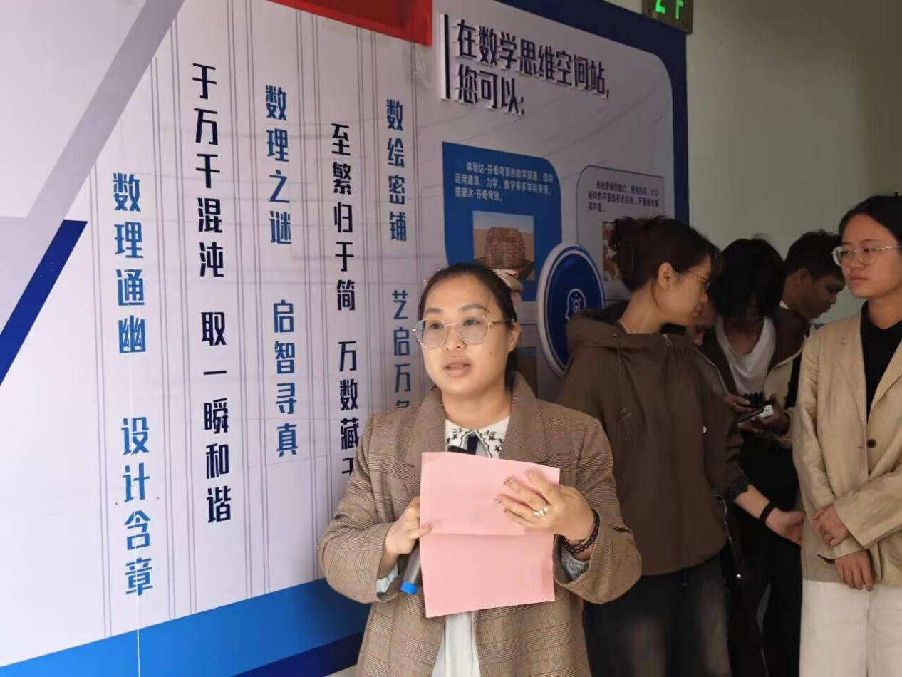 活动现场,讲解员以生动有趣的方式,为同学们逐一讲解展厅内的数学展品与知识展板。从“数学之源” 的欧拉公式,到 “于万千混沌,取一瞬和谐” 的黄金分割,再到 “永恒的迷宫 ——Julia 集” 的分形几何,同学们在图文并茂的展板前,直观理解了抽象数学概念背后的简洁与和谐之美。在互动体验区,同学们更是兴致盎然地参与各类数学实验:倾斜轨道上的小球滚动演示,让大家直观感受力学与几何的关联;彩色液体在不同几何体中的液面变化,生动诠释了体积与形状的关系;立体拼图与几何搭建游戏,则让同学们在动手操作中深化对多面体结构、拓扑变换的认知。大家围在展品前仔细观察、热烈讨论,在实践中体会数学的实用性与趣味性。