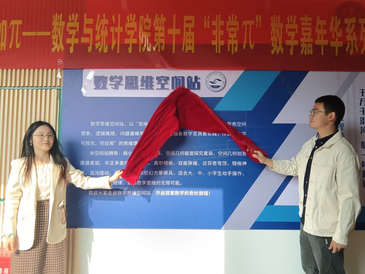 在数统楼二楼顺利举办第十届“非常 π 数学嘉年华” 开幕式活动。与此同时,“数学思维空间站” 也正式启动。学院团委书记梁卡霖,辅导员卢若楷、滕容梅老师,兼职辅导员老师们以及各学院学生代表齐聚一堂,共同见证这场数学盛宴的开启。