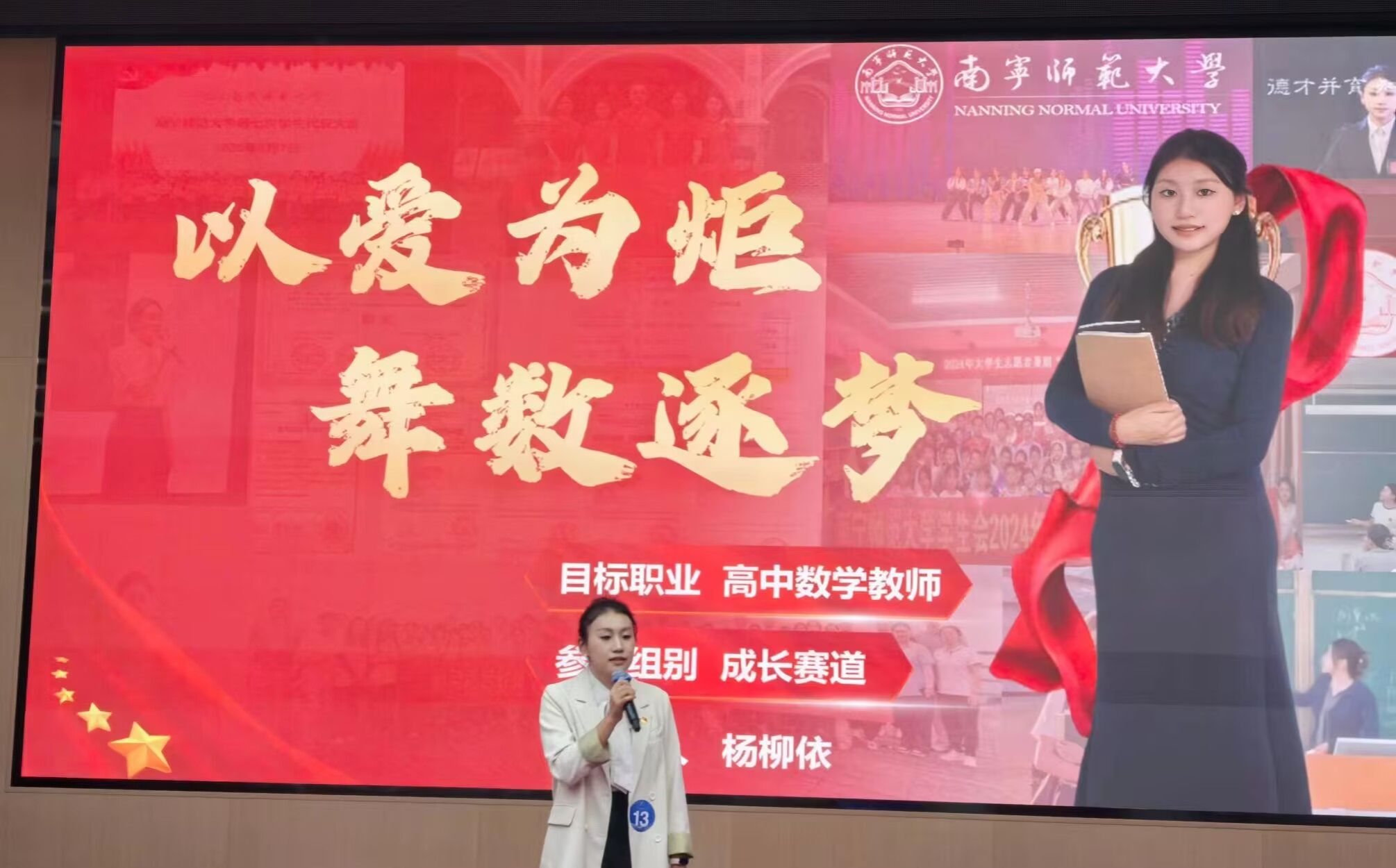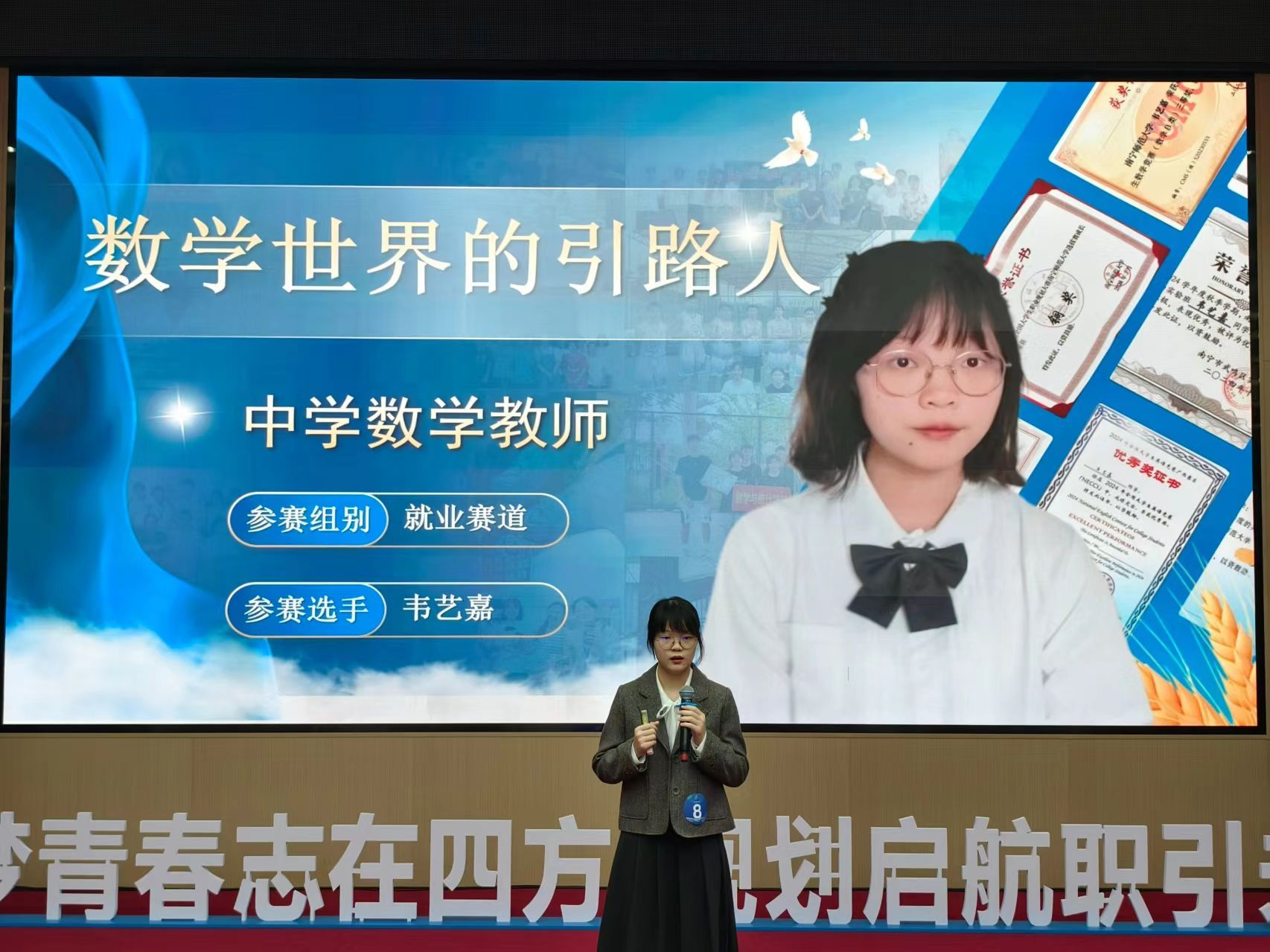 其中,2023级数学与应用数学专业1班的杨柳依同学以“以爱为炬,舞数逐梦”为主题,结合数学教师的职业缘起、学科能力和综合能力等核心优势,系统分析了中学数学教育行业的发展趋势与人才需求,构建了“教学教研技能精进—学术教学成果展示—引领数学教育改革”的三阶段规划,并以自身兴趣特长为媒介生动地展示了“美育+数学教育”的职业规划。杨同学的自信展示和成长规划获得评委的一致好评,斩获成长赛道金奖。2022级数本3班黄媛媛同学和2022级数本陶行知班韦艺嘉同学分别以“深匠心育桃李,智绘数学梦”和“以数为媒,点亮星光——做数学世界的引路人”为题,以毕业生投入职业世界、人职匹配、职业道路等视角,展示了广西中学数学教师的职业目标的规划和求职之路;两位同学清晰的职业认知和务实的行动策略获得评委认可,分别获得就业赛道的银奖和铜奖。